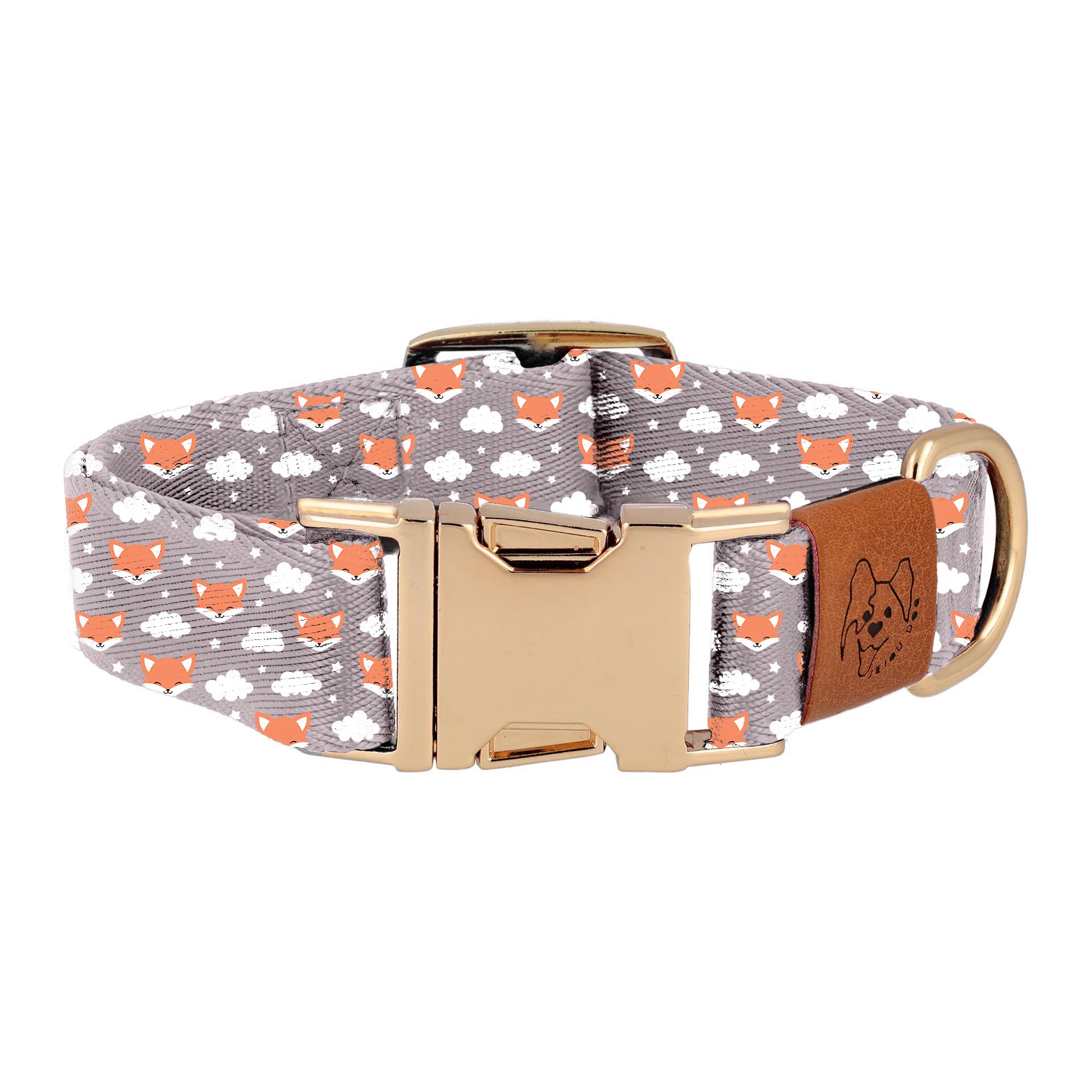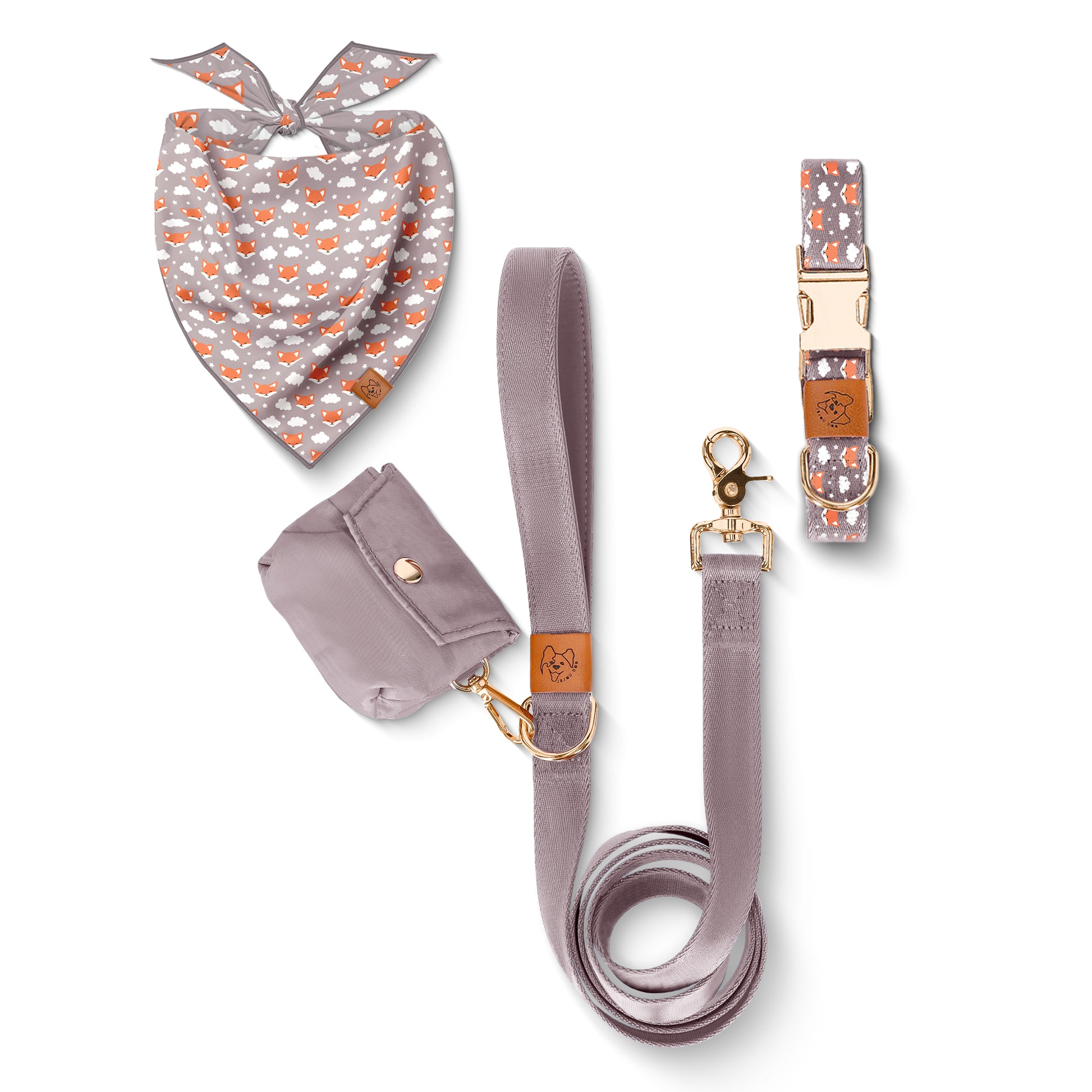 Stylish and durable matching dog collar, leash, and bandana sets made from a nylon and polyester blend fabric that is both durable and soft to the touch, paired with scratch-resistant gold accessories, designed in New York.