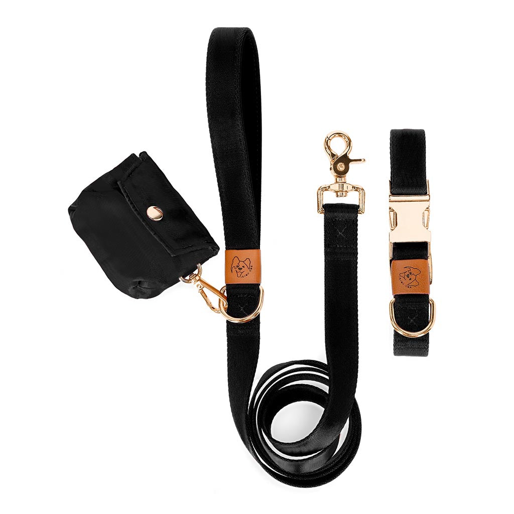 Stylish and durable matching dog collar and leash sets made from a nylon and polyester blend fabric that is both durable and soft to the touch, paired with scratch-resistant gold accessories, designed in New York.