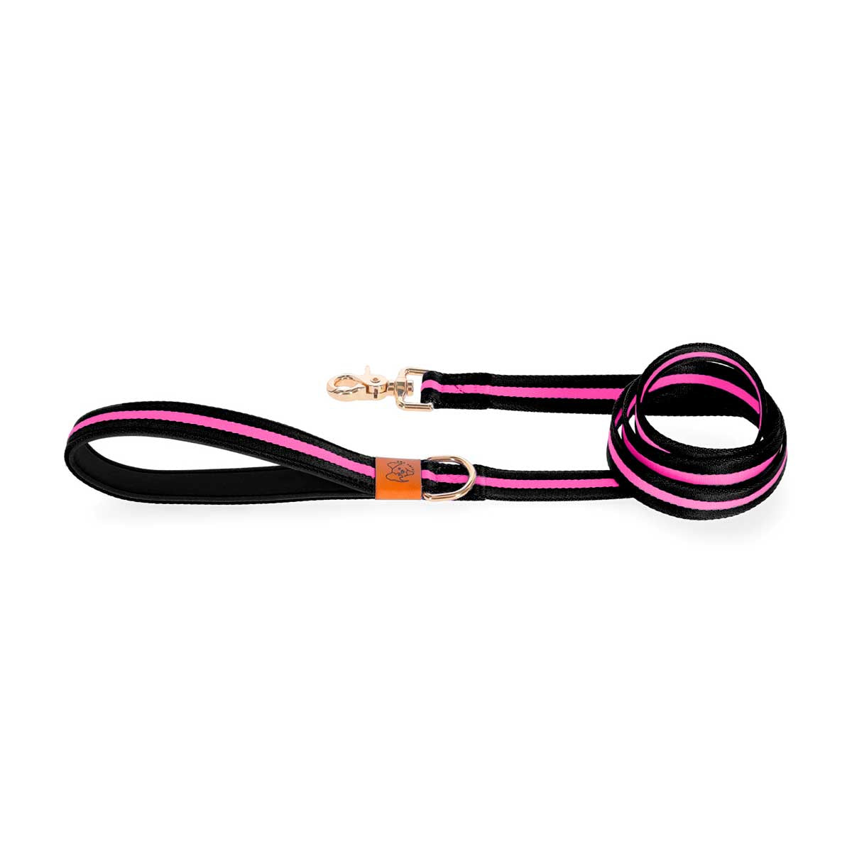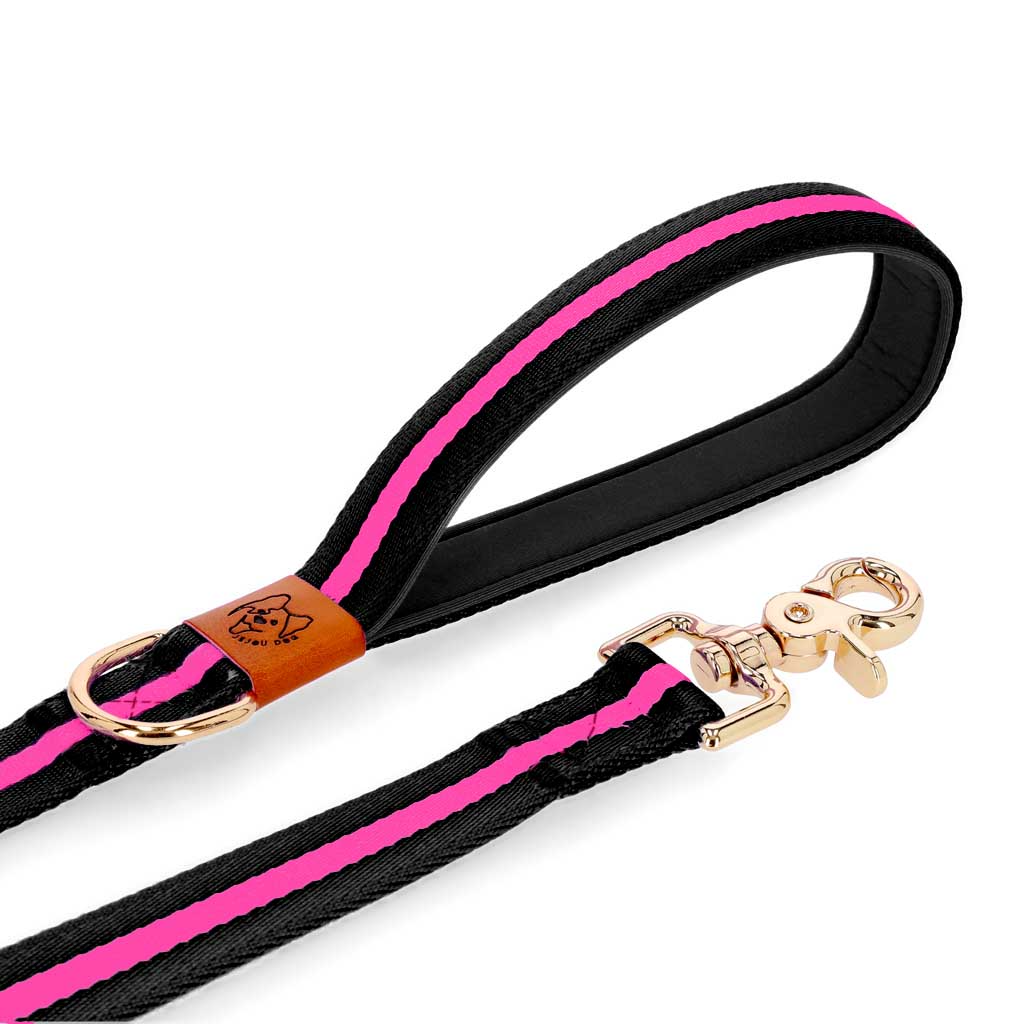 Stylish and durable dog leash with a cushioned handle, made from long-lasting nylon and polyester blend fabric, paired with a scratch-resistant gold metal hook, designed in New York.